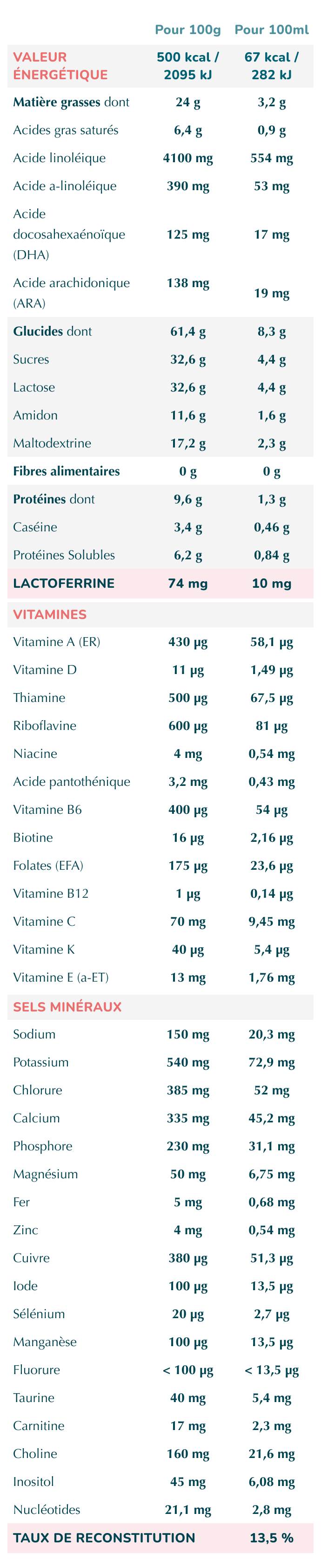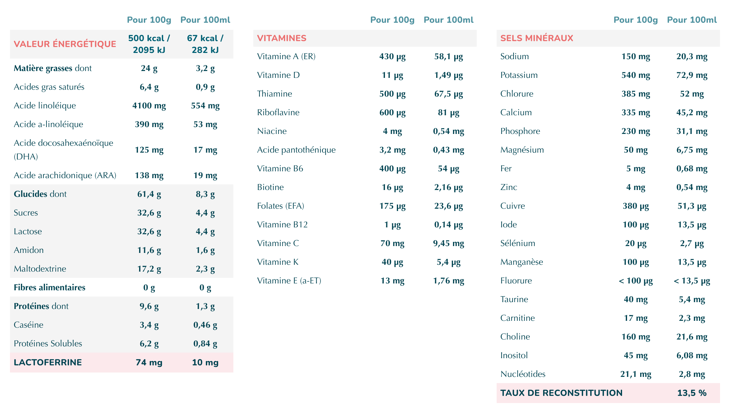 Lait écrémé, lactose, maltodextrines, amidon de maïs, huile de tournesol oléique, lactosérum déminéralisé, matière grasse de lait anhydre, protéines solubles de lait, huile de tournesol, huile de colza, émulsifiant (lécithine de soja), huile de poisson, huile de Mortierella alpina, phosphate de potassium, bitartrate de choline, chlorure de magnésium, citrate de sodium, bicarbonate de potassium, phosphate de calcium, chlorure de potassium, L-Phénylalanine, chlorure de calcium, vitamine C, carbonate de calcium, lactoferrine de lait de vache, hydroxyde de calcium, pyrophosphate ferrique, taurine, nucléotides, inositol, antioxydants (extrait riche en tocophérols, palmitate de L-ascorbyle), sulfate de zinc, L-carnitine, L-tryptophane, vitamine E, iodure de potassium, nicotinamide, sélénite de sodium, pantothénate de calcium, sulfate de cuivre, thiamine, vitamine B6, vitamine A, sulfate de manganèse, acide folique, vitamine K, biotine, vitamine D, vitamine B12, riboflavine, ferments lactiques (Bifidobacterium infantis)