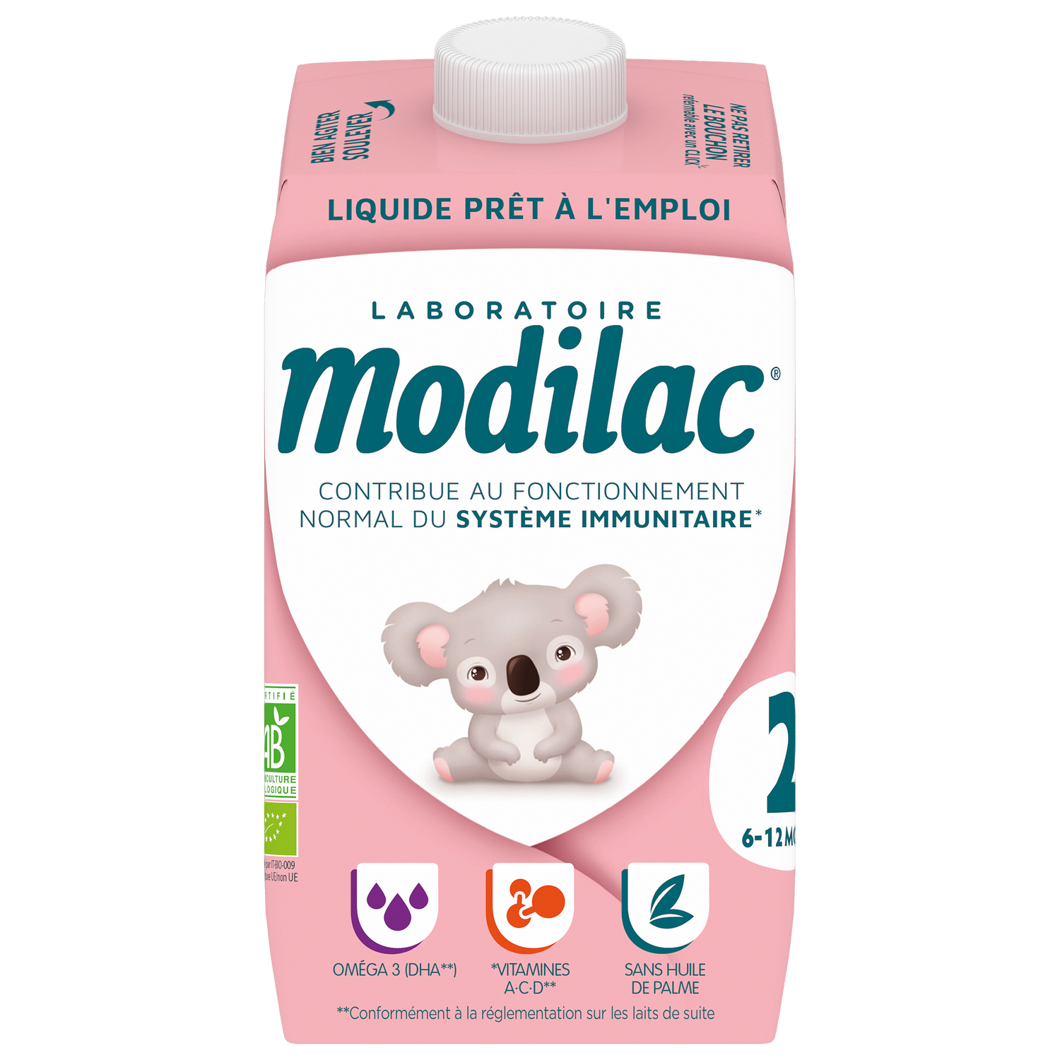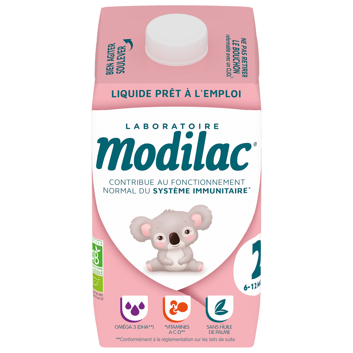 Modilac Bio 2 a été élaboré pour répondre aux besoins nutritionnels spécifiques de votre bébé, en complément d’une alimentation progressivement diversifiée, conformément à la réglementation. Modilac Bio 2 contient des vitamines A, C et D* qui contribuent au fonctionnement normal du système immunitaire.