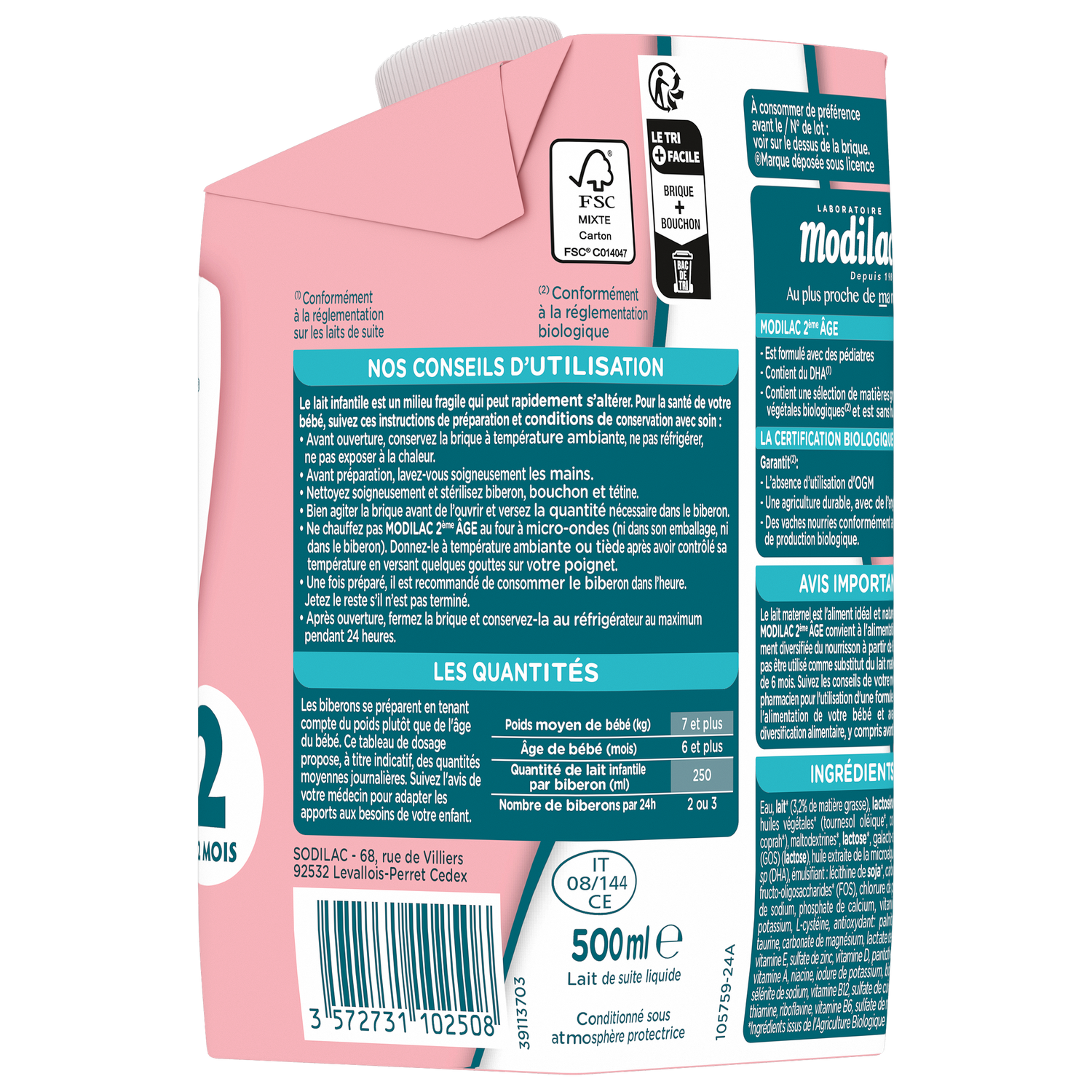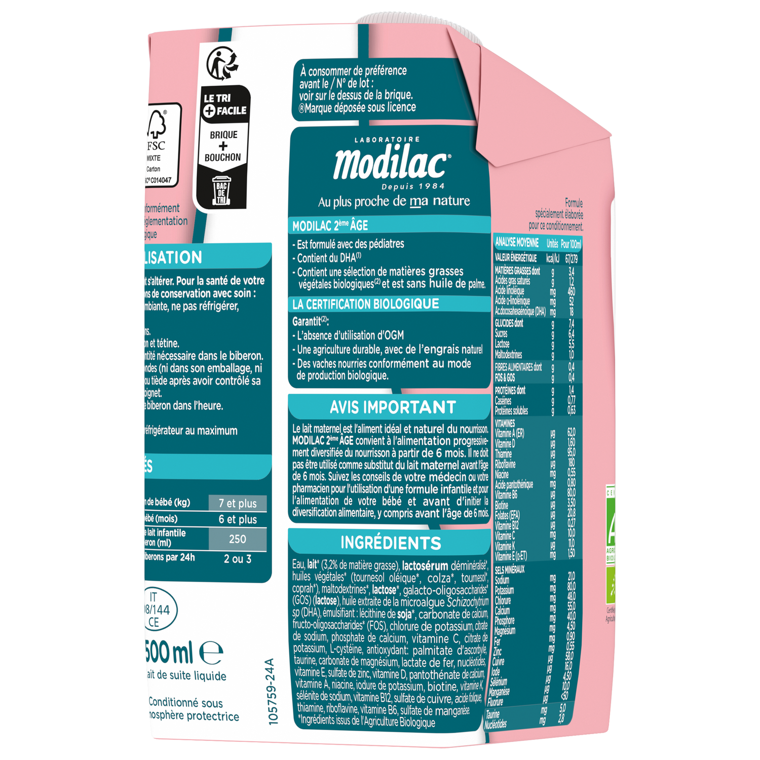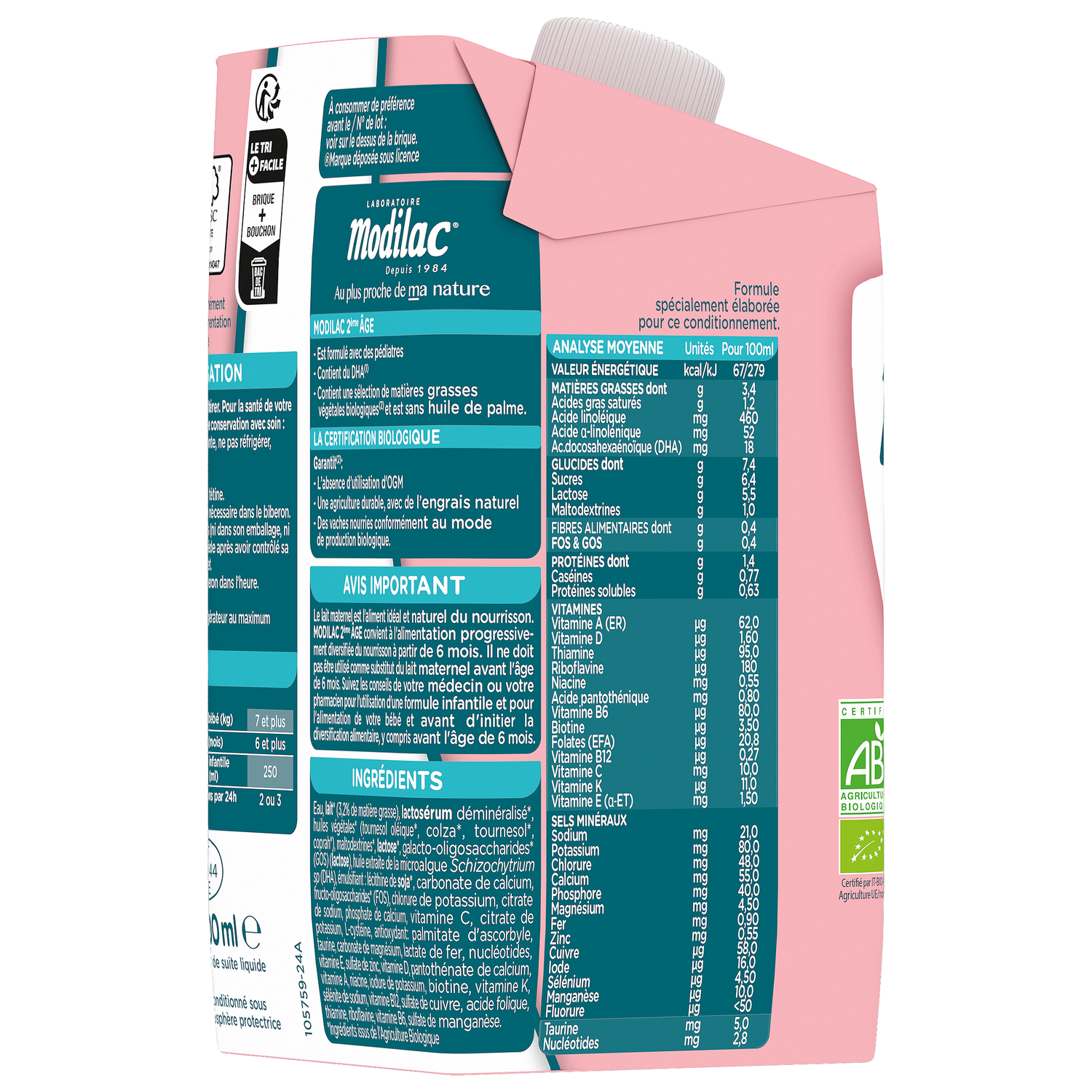 AVIS IMPORTANT: Le lait maternel est l’aliment idéal du nourrisson. Modilac Bio 2 convient à l’alimentation progressivement diversifiée du nourrisson à partir de 6 mois. Il ne doit pas être utilisé comme substitut du lait maternel avant l’âge de 6 mois. Suivez les conseils de votre médecin ou de votre pharmacien pour l’utilisation d’un lait infantile et pour l’alimentation de votre bébé.