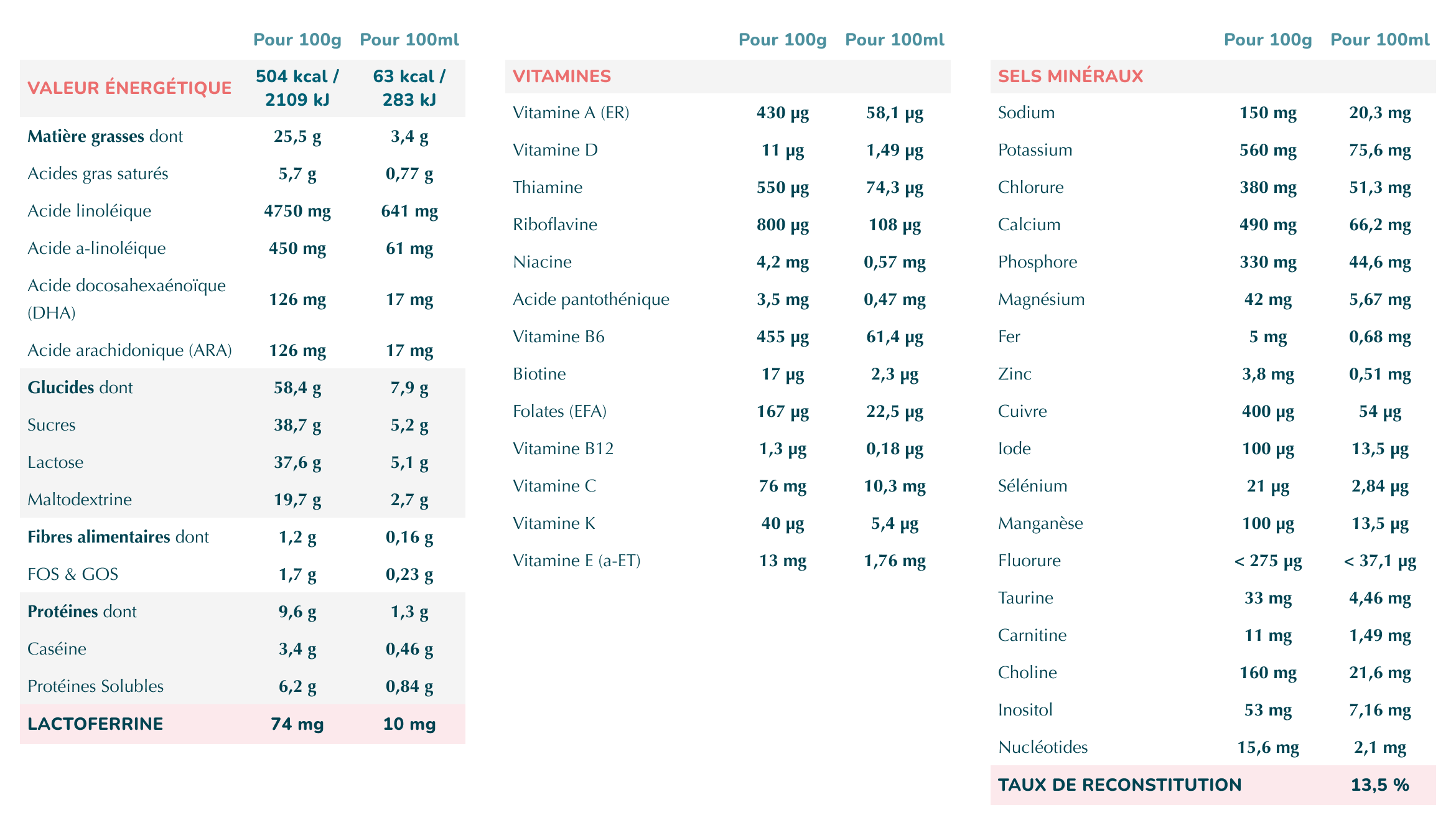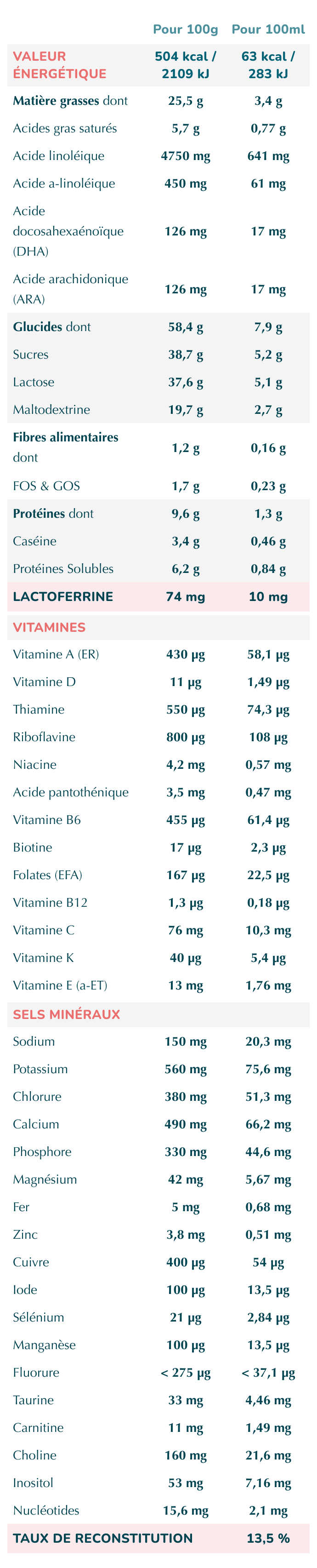 Lait écrémé, maltodextrines, lactosérum déminéralisé, lactose, huile de tournesol oléique, matière grasse de lait anhydre, huile de tournesol, huile de colza, protéines solubles de lait, galacto-oligosaccharides (GOS) (lactose), émulsifiant (lécithine de soja), huile de poisson, chlorure de calcium, huile de Mortierella alpina, phosphate de sodium, bitartrate de choline, L-phénylalanine, citrate de magnésium, fructo-oligosaccharides (FOS), vitamine C, lactoferrine de lait de vache, pyrophosphate ferrique, hydroxyde de potassium, taurine, antioxydants (extrait riche en tocophérols, palmitate de L-ascorbyle), inositol, nucléotides, sulfate de zinc, L-tryptophane, iodure de potassium, vitamine E, L-carnitine, nicotinamide, sélénite de sodium, pantothénate de calcium, sulfate de cuivre, thiamine, vitamine B6, vitamine A, sulfate de manganèse, acide folique, vitamine K, biotine, vitamine D, vitamine B12, riboflavine, ferments lactiques (Bifidobacterium infantis)