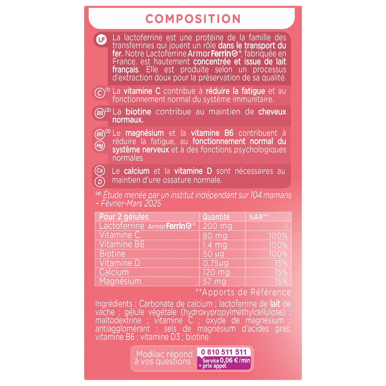 Carbonate de calcium ; lactoferrine de lait de vache ; gélule végétale (hydroxypropylméthylcellulose) ; maltodextrine ; vitamine C ; oxyde de magnésium ; antiagglomérant : sels de magnésium d’acides gras; vitamine B6 ; vitamine D3 ; biotine.