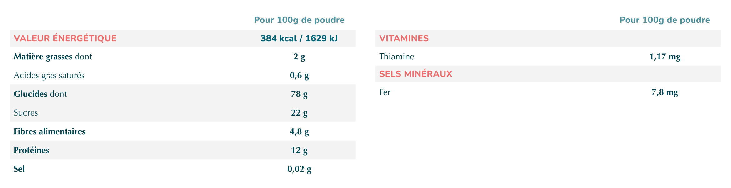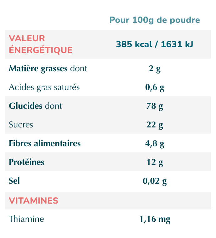 Farine de céréales (farine de blé partiellement hydrolysée* 79,5%, farine de riz* 8,5%, farine d’avoine* 5%), poudre de cacao maigre* 6%, vitamine B1.