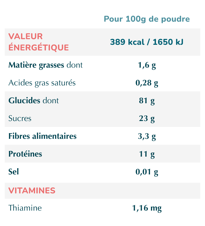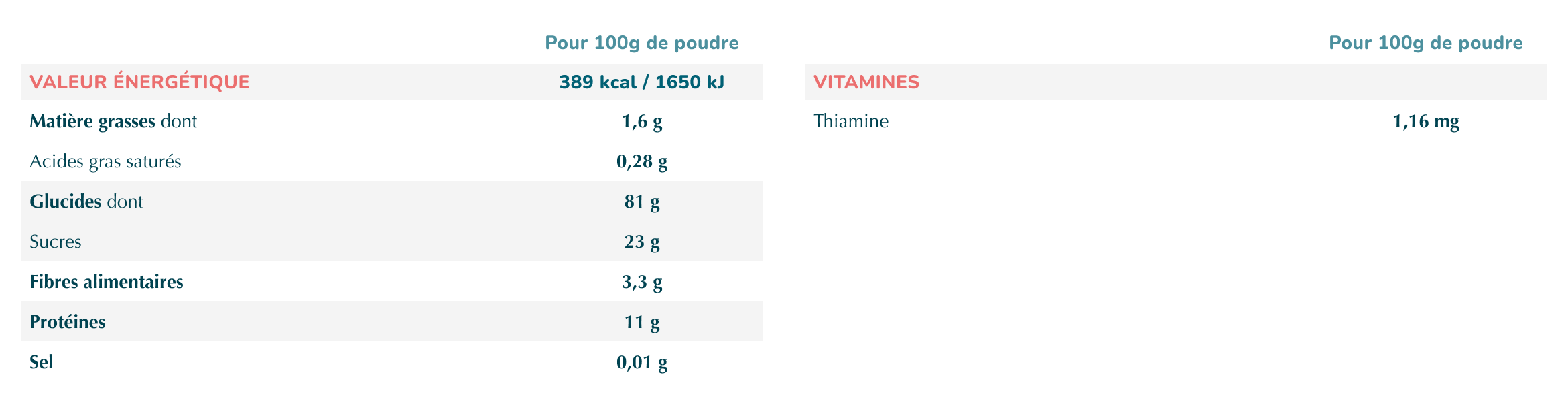 Farine de céréales (farine de blé partiellement hydrolysée* 84,9%, farine de riz* 8,8%, farine d’avoine* 5,2%),  vitamine B1.