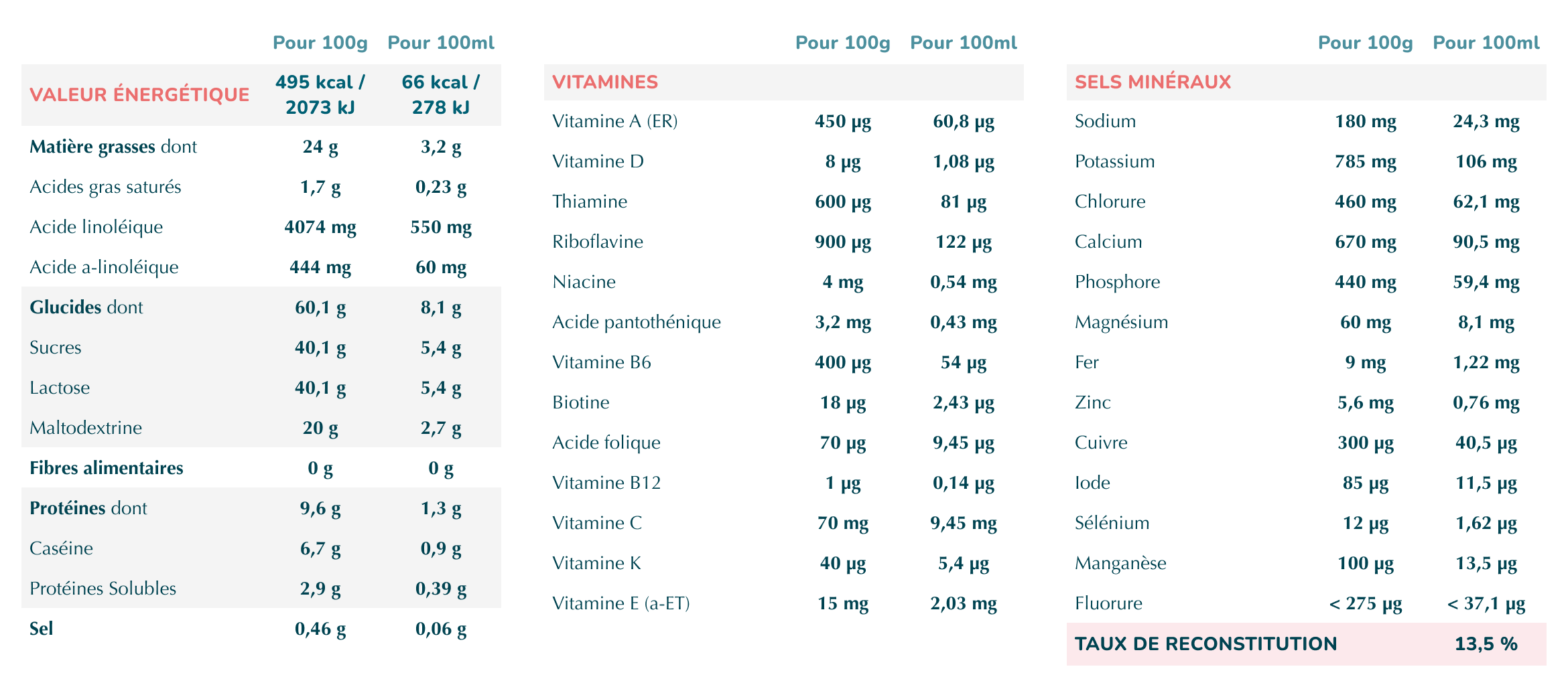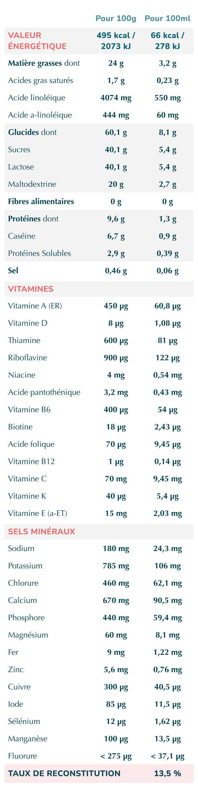 Lait écrémé, huiles végétales (tournesol oléique, colza, tournesol), maltodextrines, lactose, lactosérum déminéralisé, citrate de calcium, phosphate de potassium, chlorure de calcium, phosphate de sodium, émulsifiant (lécithine de soja), citrate de magnésium, vitamine C, sulfate ferreux, hydroxyde de potassium, sulfate de zinc, antioxydants (extrait riche en tocophérols, palmitate de L-ascorbyle), vitamine E, chlorure de potassium, nicotinamide, iodure de potassium, pantothenate de calcium, sélénite de sodium, sulfate de cuivre, vitamine A, thiamine, vitamine B6, sulfate de manganèse, acide folique, vitamine K, biotine, vitamine D, vitamine B12